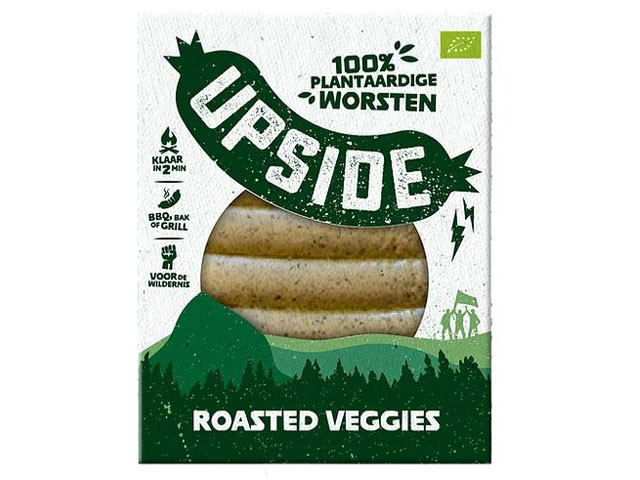 De 100% plantaardige Roasted Veggies worsten van Upside hebben een lekkere hartige bite. Gemaakt van seitan met vleugje geroosterde groente. Lekker op de BBQ of gril, klaar in 2 minuten. Tip van de makers van Upside: "Deze worsten zijn heerlijk op een puntje met gebakken uitjes, scherpe mosterd, en wat ketchup."
