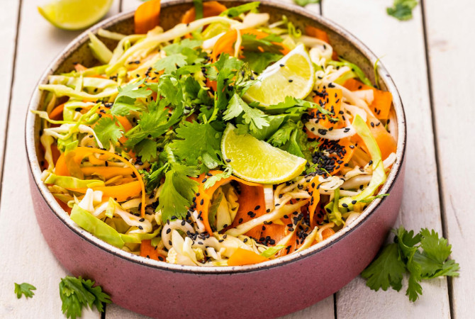 Deze frisse Aziatische koolsla is een instant klassieker. Eenvoudige basis: geraspte wortel en witte kool. Maar daar dan écht iets lekkers van maken - laat dat maar aan de Aziatische keuken over. Sesam, 'n bosuitje, gember, koriander, witte wijnazijn en honing... Daarmee wordt dit bijgerecht een heerlijke rauwkostslaatje.