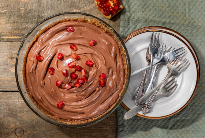Garneer de taart bijvoorbeeld met granaatappelpitjes of pistachenootjes en snijd er kleine puntjes van. Eet de taart samen in goed gezelschap. Feest!