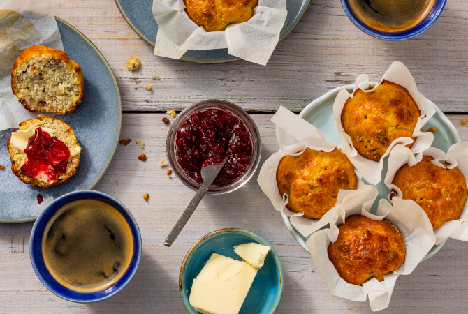 Deze heerlijke glutenvrije scones maak je van amandelmeel en noten. Je serveert ze bij het (weekend)ontbijt, lunch of bij de koffie/thee. besmeer ze met bijvoorbeeld roomboter en frambozen fruitbeleg.