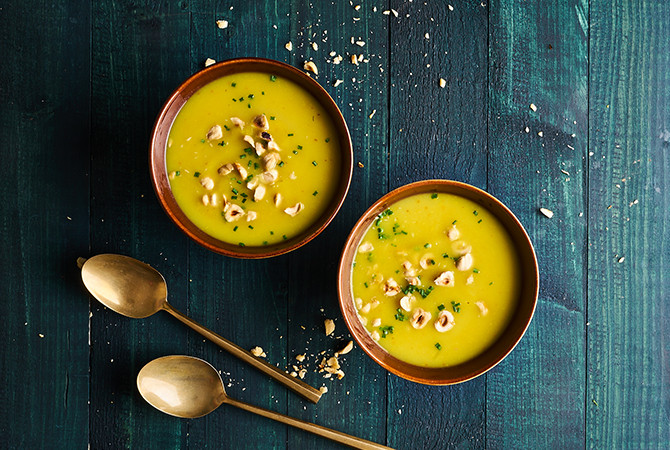 Schep de soep in kommen en hak de hazelnoten grof. Hak de peterselie fijn en strooi beide over de soep. Lekker met geroosterd brood.