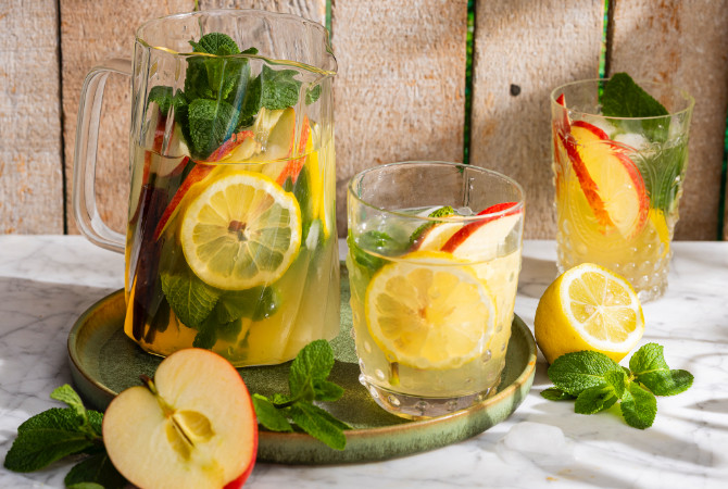 Verwijder de theezakjes en de munt, snijd de citroen en appel in schijfjes en voeg toe.