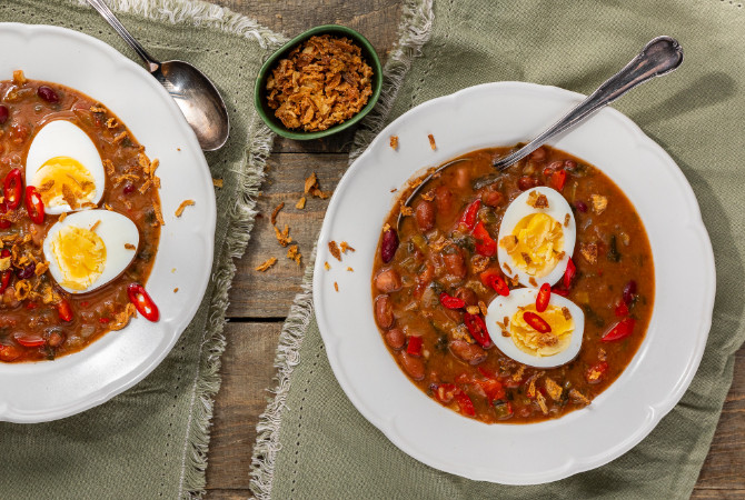7. Serveer de soep met een gehalveerd ei, rode peper ringen en de gebakken uitjes.