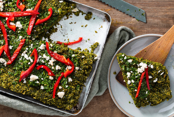 Deze Mediterraanse plaattaart is heel makkelijk te maken; alles in de foodprocessor mixen en hoppakee zo de oven in.