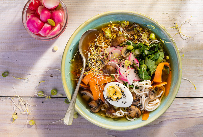 Garneer met de gefermenteerde radijsjes, kiemen, bosui en evt een handje sesamzaadjes. Met gekookte ramen en een zacht gekookt ei erbij een zeer complete en gezonde maaltijd!