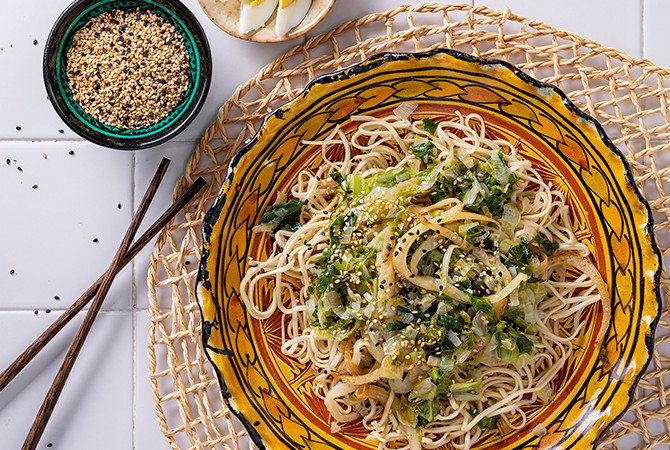- Verdeel de noedels over borden. Schep de groenten er in een bergje bovenop, en bestrooi met de geroosterde sesam. Zet er de gefrituurde plukjes noedels zo hoog mogelijk bovenop.