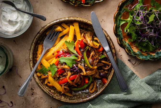 Verwarm wanneer de frites in de oven staan een scheutje olijfolie in een koekenpan. Bak de ui ringen een minuut of vijf op matig vuur. Voeg vervolgens de paprika en oesterzwammen toe en zet het vuur hoger. Bak de groenten een minuut of vijf voeg dan de shoarmakruiden toe en maak op smaak met eventueel peper en zout.