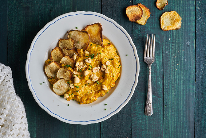 De zoete zachte smaak van pompoen combineert heel fijn met de hartige, krokante aardpeerchips. Ook nog leuk; als je alles goed plant (dus zet alvast je oven en waterkoker aan), dan staat dit gerecht in een half uur op tafel.