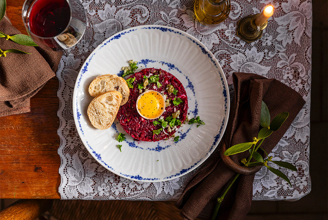 Plant-aardig tartaartje van gepofte rode biet van onze eigen telers. Vega met eitje erbovenop. Vegan? Laat 't eitje weg.
