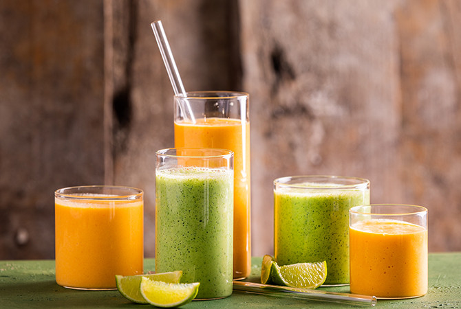 Deze twee smoothies zijn de perfecte vitaminebommetjes om je de winter door te helpen. Op deze manier begin je de dag al met een goede dosis groenten en fruit.